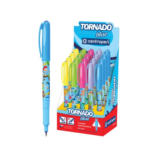 Obľúbené guľôčkové pero Tornado s trojuholníkovou úchopovou časťou s masážnymi bodmi, s tenkou rovnomernou stopou šírky 0.3 mm, ktorá sa dá vyzmizíkovať, atramentová náplň modrej farby. Telo pera je z kvalitného plastu, dodávané v 5 farebných kombináciách. Pero je určene pre pravákov, ľavákov i dysgrafikov.