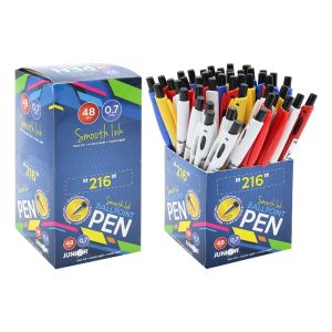 Jednoduché guľôčkové pero s trojhranným, priehľadným telom (dostupné v 4 farbách). čierny atrament, hladké písanie stopa (hrot) 0,7 mm nasadzovacie viečko vrúbkovaný úchop proti kĺzaniu pera náhradná náplň: jednorazová Balenie obsahuje 50 ks.Cena je za 1 kus.
