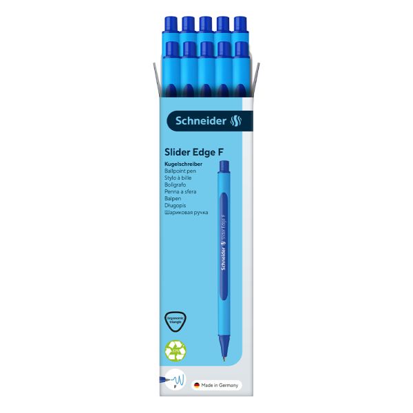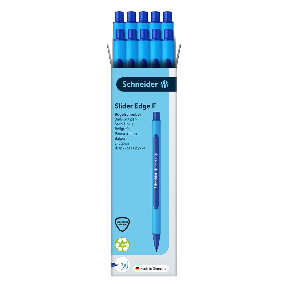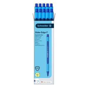 Guličkové pero, 0,3 mm, s uzáverom, SCHNEIDER Slider Edge F, modré. Vyrobené inovatívne "ViscoGlide" technológiu. Písmo spája Najnovšie vlastnosti plniace pier a rollerov.Pogumované telo pera trojuholníkového tvaru. Nerozmaže sa ani na lesklom povrchu. Uzáver vo farbe náplne. Rýchloschnúci atrament. Odolné Voči vyschnutím. Jednorazové.