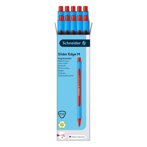 Guličkové pero, 0,5 mm, s uzáverom, SCHNEIDER Slider Edge F, červené. Vyrobené inovatívnou „ViscoGlide” technológiou. Písmo spája najnovšie vlastnosti plniacich pier a rollerov.Pogumované telo pera trojuholníkového tvaru. Nerozmaže sa ani na lesklom povrchu. Uzáver vo farbe náplne. Rýchloschnúci atrament. Odolné voči vyschnutiu. Jednorazové.