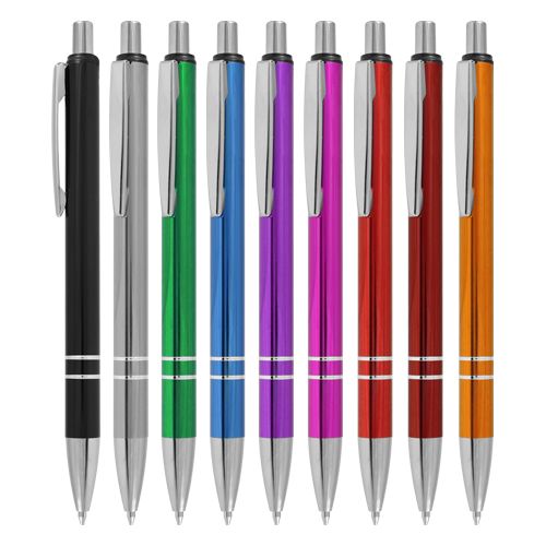 Guľôčkové pero s metalickou hliníkovou úpravou a pochrómovanými doplnkami. Priemer hrotu je 1,0 mm.