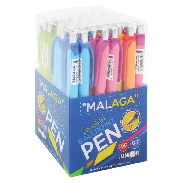 Jednoduché guľôčkové pero s trojhranným, priehľadným telom (dostupné v 4 farbách). modrý atrament, hladké písanie stopa (hrot) 0,7 mm nasadzovacie viečko vrúbkovaný úchop proti kĺzaniu pera náhradná náplň: jednorazová Balenie obsahuje 50 ks.Cena je za 1 kus.