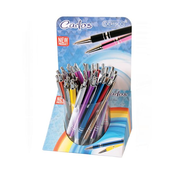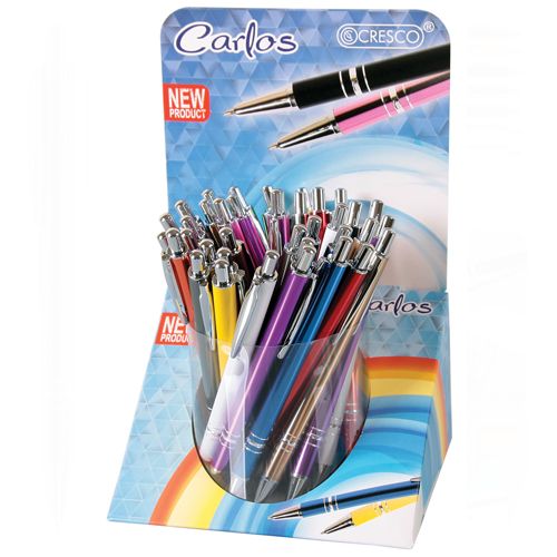 Guľôčkové pero Carlos Rena s kovovým telom a stláčacím mechanizmom. O príjemný pocit z písania sa stará 1,0 mm hrubá modrá náplň.