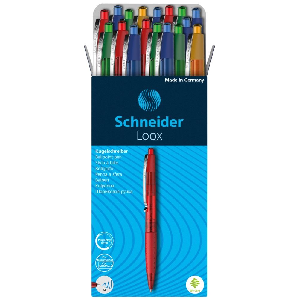 Guľôčkové pero SCHNEIDER Loox s transparentným telom, s vymeniteľnou náplňou. Komfortný úchop vďaka pogumované úchopové zóne. V ponuke mix farieb: červená;modrá;zelená;žltá.