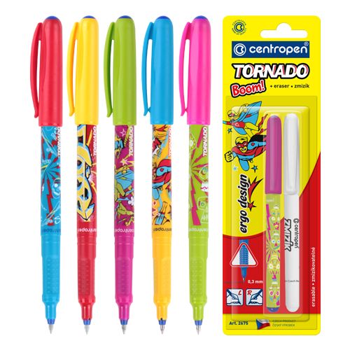 Obľúbené guľôčkové pero Tornado s trojuholníkovou úchopovou časťou s masážnymi bodmi, s tenkou rovnomernou stopou šírky 0.3 mm, ktorá sa dá vyzmizíkovať, atramentová náplň modrej farby. Telo pera je z kvalitného plastu, dodávané v 5 farebných kombináciách. Pero je určene pre pravákov, ľavákov i dysgrafikov. Predávané na blistri ako sada: Tornado Blue + zmizík.
