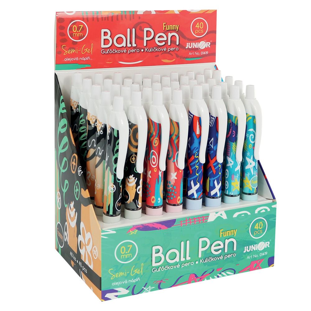 Guľôčkové pero FUNNY v pestrých farbách s modrou náplňou.