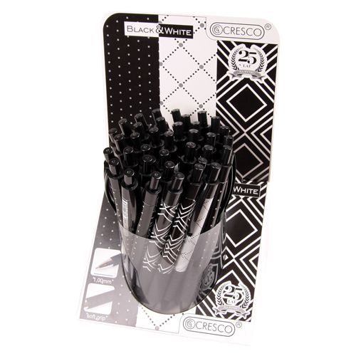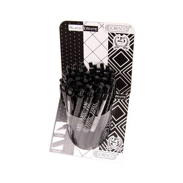 Guľôčkové pero s plastovým telom a ergonomicky tvarovaným gumovým úchopom. Pero má príjemné vyhotovenie s pogumovaným povrchom. Náplň modrá, šírka hrotu 1.00 mm. Dizajn: Black and White.