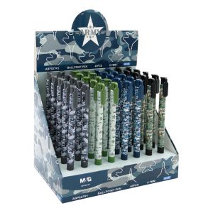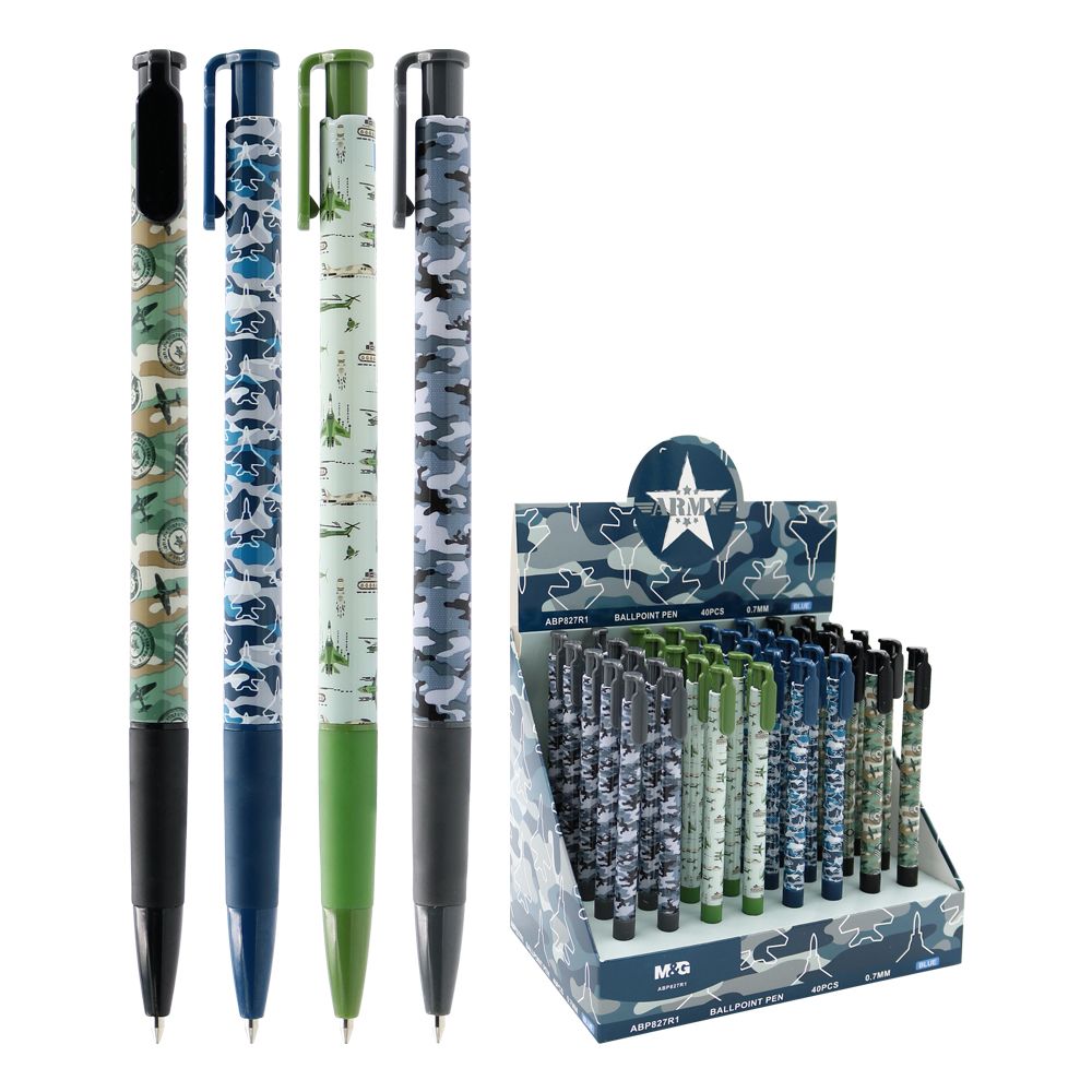 Klasické guľôčkové pero od značky M&G, kategória Army. Plastové telo s príjemným gumovým úchopom na držanie. Farba atramentu je modrej farby, stopa guľôčky je 0,7 mm.