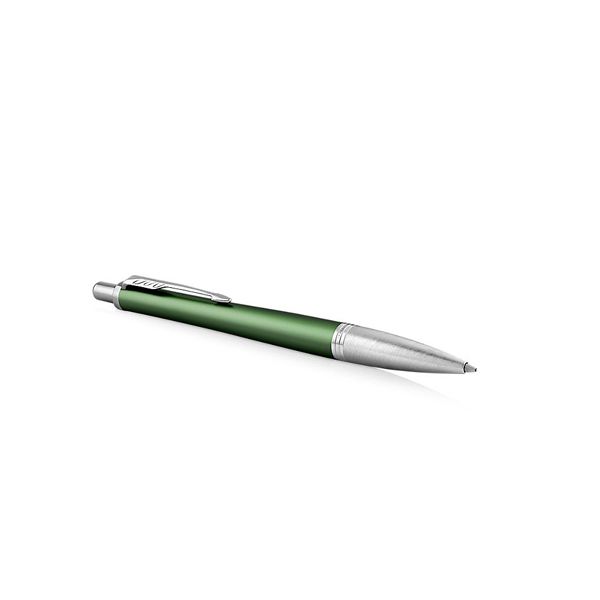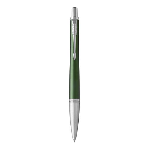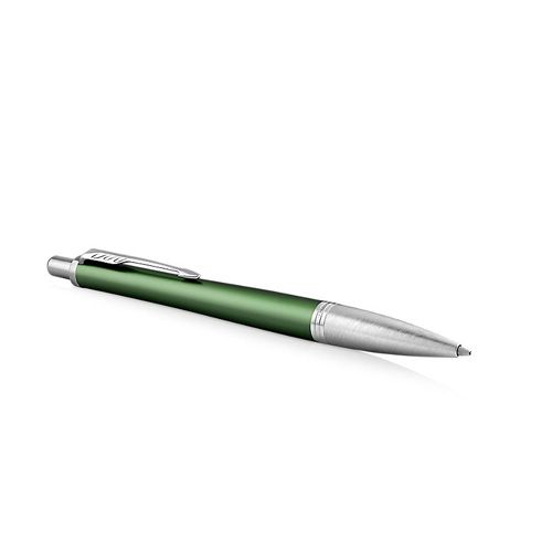 Modelová rada Urban, to je osobitný štýl a mimoriadny výkon. Vizuálne nápadný Urban poúva tradičné hranice značky Parker a nastavuje nové pravidlá moderného písania. Nezameniteľné dizajnové rysy a široká paleta prevedenia robí z Urbanu skvelý módny doplnok, ktorý podporí Vašu sebaistotu v každej situácii. Metalické zelené telo z eloxovaného hliníka, upravené pieskovaním. Mosadzný vrchnák s povrchovou dekoratívnou štruktúrou vytvorená leptaním, pokovované chrómom a leštený. V kombinácii s doplnkami pokovovanými chrómom. Hrot z ušľachtilej nerez ocele.