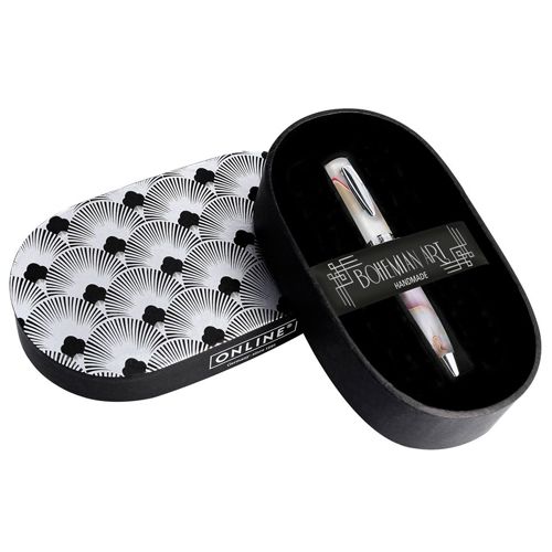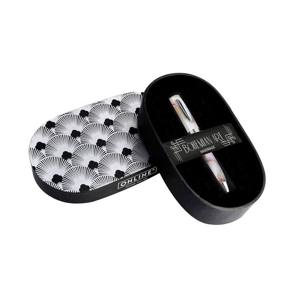 Ušľachtilé guľôčkové pero ONLINE Bohemia Art White je vyrobené z polopriehľadného akrylu, v strednej veľkosti, vysoko kvalitného spracovania - v štýle bohéma. Guľôčkové pero, vybavené kvalitným otočným mechanizmom a medzinárodnou náplňou D1 v čiernej farbe písania, zaručuje čisté potešenie z písania. Materiál: kov. Šírka stopy: M. Vďaka zaujímavému akrylu je každý kus originálny. Darčeková krabica presne zapadá do bohémskeho štýlu a robí z guličkového pera perfektný darček pre všetkých retro fanúšikov.