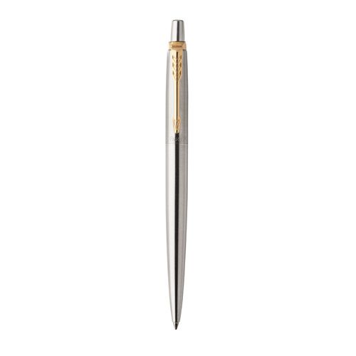 Parker Jotter je dizajnérskou klasikou a dôverne známym modelovým radom, oceňovaným predovšetkýn pre svoju kvalitu, spoľahlivosť a priaznivý pomer ceny a výkonu. Telo a vrchnák z brúsenej nerez ocele. V kombinácii s klipom pokovovaný zlatom, s leštenou úpravou.