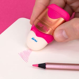 Kombinovaná guma a strúhadlo MILAN Capusle Copper so zásobníkom v jednom. Guma je schovaná pod vrchnákom. Ostrá, odolná uhlíková čepeľ strúhadla, so systémom ktorý zabraňuje oddeleniu čepele od tela strúhadla. Ideálne pre školákov a študentov. Dostupné v najrôznejších farbách: čierna, ružová, fialová, zelená.
