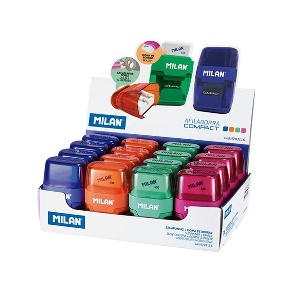 Kombinovaná guma 430 a dvojité strúhadlo (štandardné a veľkosti MAXI), dizajn COMPACT. Štvorcová guma je vyrobená zo syntetickej gumy. Orezávač na ceruzky má ostré a odolné oceľové ostrie, vďaka čomu je ideálny pre všetky druhy ceruziek. Disponuje tiež bezpečnostným systémom čepele, ktorý zabraňuje odtrhnutiu čepele od tela strúhadla. 4 rôzne farby: modrá, oranžová, ružová a zelená.