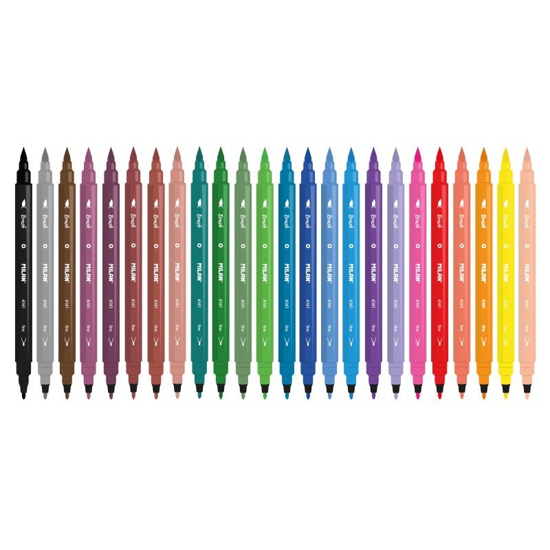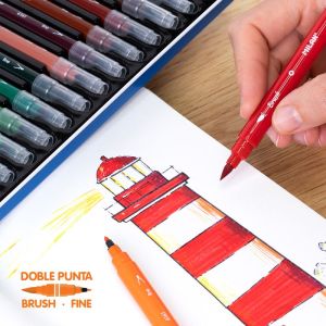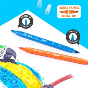 Obojstranné kreatívne popisovače, ktorých hroty umožňujú jednoduché farbenie, kreslenie, skicovanie a tieňovanie. Štetcový hrot – šírka stopy 1 mm (pre detailné zvýraznenie riadkov). Guľatý hrot – šírka stopy 1mm. Vysoko pigmentovaný, dlhotrvajúci a rýchloschnúci atrament odolný voči rozmazaniu a vyblednutiu. Dĺžka popisovača 160 mm. Farba: svetlo zelená.