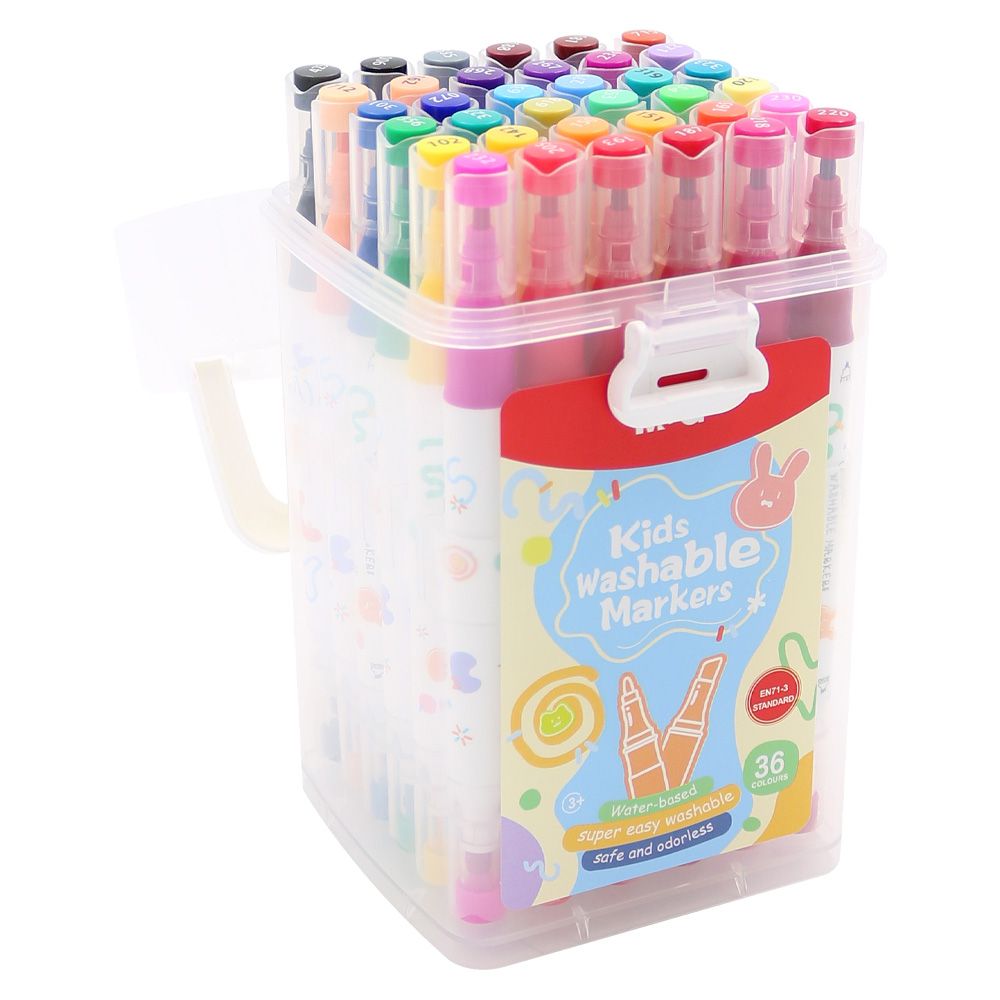 Sada obojstranných popisovačov pre deti v praktickom kufríku. pigment na vodnej báze bezpečné a bez zápachu ľahko sa dajú vyprať kužeľový / klinový zkosený hrot 36 farieb v sade