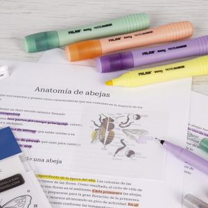 Zvýrazňovač má klinový hrot na písanie. Sada štyroch pastelových farieb, akými sú žltá, oranžová, fialová a zelená.