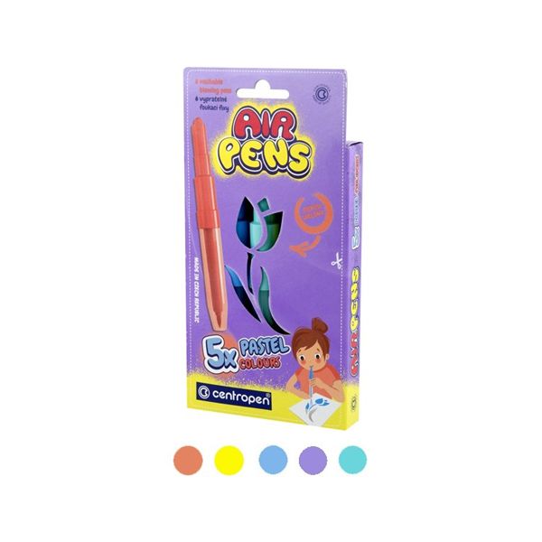 5-kusová sada fúkacích popisovačov, vhodných na papier. Fixy sú plnené zadravotne nezávadným atramentom. Ľahko umývateľné a vyprateľné. Sada obsahuje 5 ks pastelových odtieňov a 1 ks šablóny.