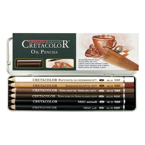 Sada 6 olejových ceruziek, vynikajúcich pre všeobecné použitie, na skicovanie a kreslenie. K dosiahnutí hustých, lesklých, nerozmazávajúcich ťahov. Ceruzky sú na báze oleja, a preto odolné proti vode. Plechová krabička v papierovom obale ideálne ochráni ceruzky proti prípadnému polámaniu. Výber zahŕňa odtiene: White Chalk, Sanguine, Sepia light, Sepia dark, Nero soft a extra soft.