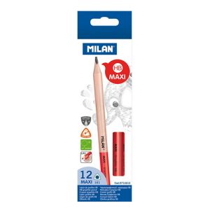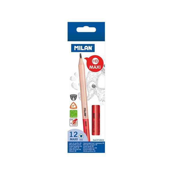 Trojhranná ergonomická ceruzka MAXI MILAN je ideálna pre priemyselné použitie. Tvrdosť tuhy HB, priemer 3,5 mm. Ceruzka je odolná voči zlomeniu, vďaka svojmu systému LPS, ktorý zosilňuje tuhu. Drevo pochádza z trvalo udržateľných lesov.