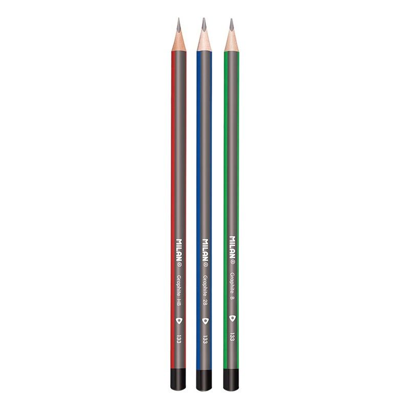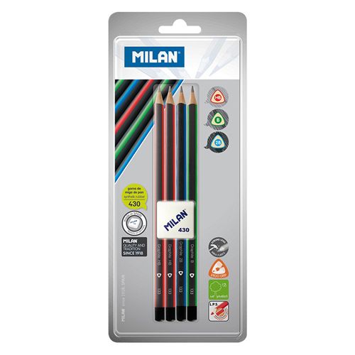 Sada 4 trojhranných grafitových ceruziek MILAN tvrdosti: 2x HB, 1x B, 1x 2B určených pre písanie a kreslenie. V balení sa nachádza aj mäkká syntetická guma č. 430, vhodná pre odstránenie grafitových…