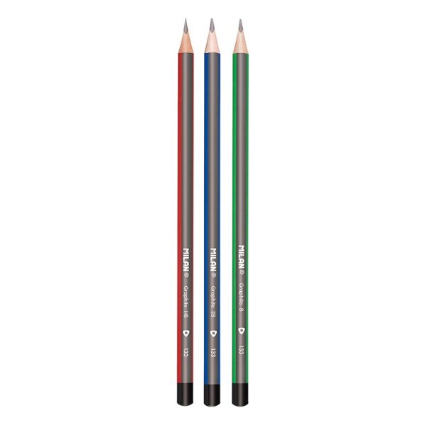 Sada 4 trojhranných grafitových ceruziek MILAN tvrdosti: 2x HB, 1x B, 1x 2B určených pre písanie a kreslenie.