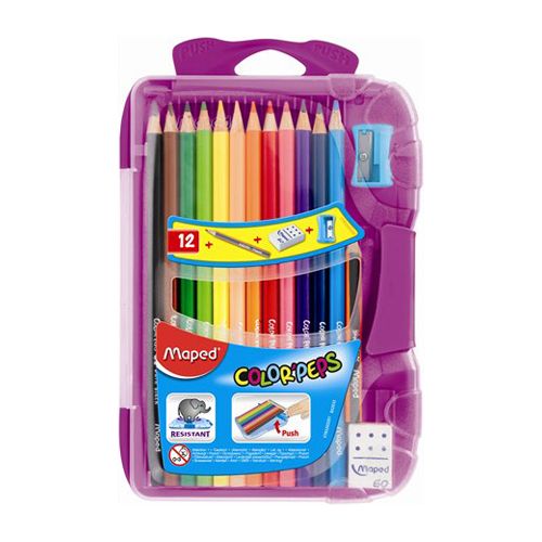 Pastelky v boxe, ktorý je odolný proti rozbitiu. Trojhranné telo pastelky umožňuje pohodlné uchopenie. Mäkká a odolná tuha, jasné farby. Balenie obsahuje 12 ks pasteliek, gumu a orezávatko. Francúzka značka MAPED zaručuje vysokú kvalitu, funkčnosť a moderný dizajn.