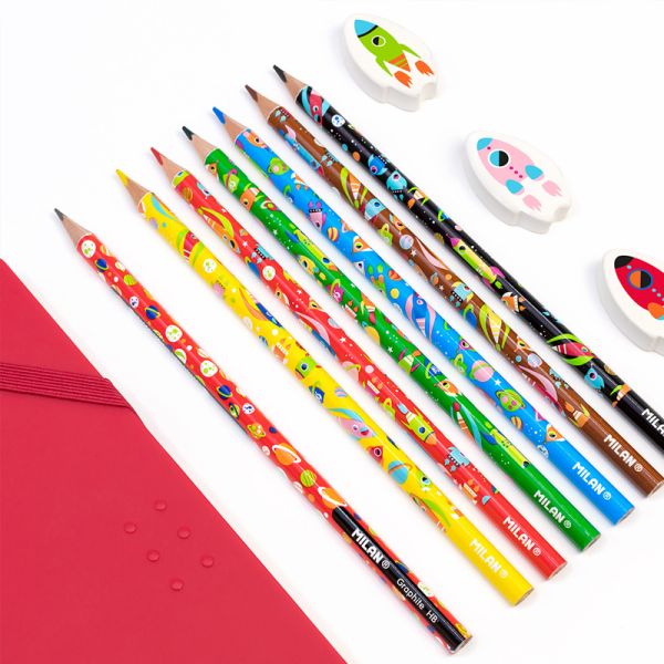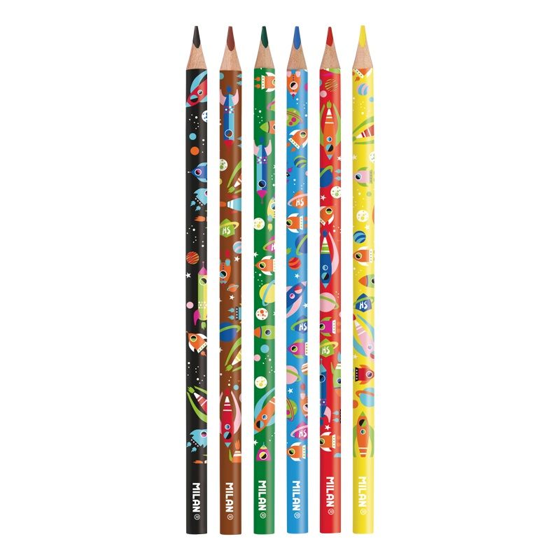 Sada farebných ceruziek a ich špeciálne vydanie Super Heroes Space. Ergonomický trojuholníkový tvar. Grafitová tuha je odolná voči zlomeniu - vďaka svojmu systému LPS (Lead Protection System). Drevo pochádza z trvalo udržateľných lesov. 6 farieb: žltá, modrá, hnedá, čierna, červená, zelená.