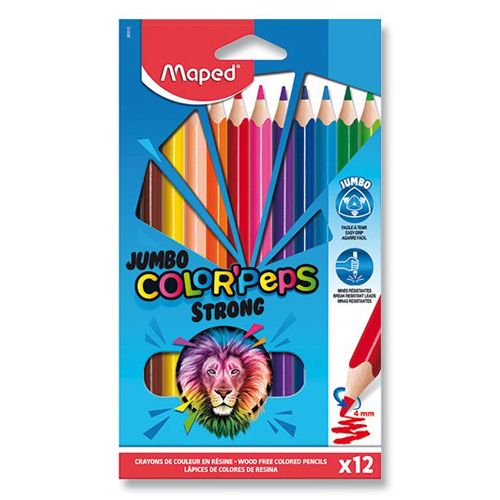 Pastelky trojhranné MAPED "COLOR'PEPS STRONG JUMBO". Výborná krycia schopnosť. Pohodlne sa držia. Tuhy sú odolné proti lámaniu. ľahko sa strúhajú. Trojuholníkový tvar ponúka ľahké uchopenie a je ideálny pre deti, ktoré sú nadšené umením, ktoré chcú kresliť, vyfarbovať, zdobiť a obohatiť svoje kresby. Priemer tuhy 4 mm. Balenie obsahuje 12 ks.