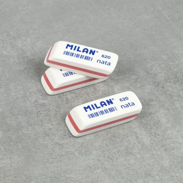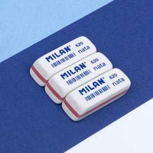 Obdĺžniková guma MILAN 445 z mäkkej syntetickej gumy. Môže byť použitá na gumovanie širokej škály ťahov grafitovej ceruzky zo všetkých druhov papiera. S detským dizajnom v rôznych farbách: biela, ružová, zelená.