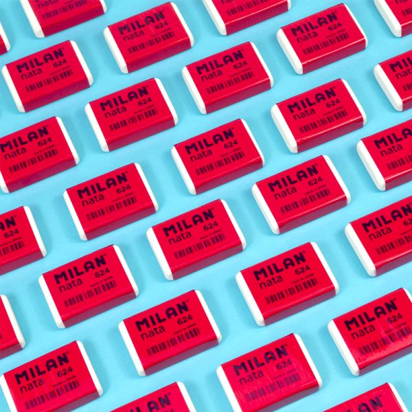 Obdĺžniková guma MILAN 445 z mäkkej syntetickej gumy. Môže byť použitá na gumovanie širokej škály ťahov grafitovej ceruzky zo všetkých druhov papiera. S detským dizajnom v rôznych farbách: biela, ružová, zelená.