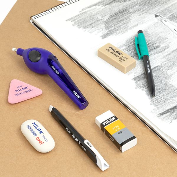 Biela extra mäkká plastová guma s veľkou absorpčnou silou. Maže bez zanechania hobliny. Vhodné pre mazanie ťahov a ceruziek a mäkkou tuhou.