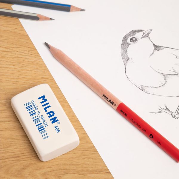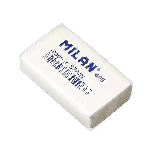 Pružná guma MILAN 406 je zo syntetického kaučuku. Môže byť použitá na vymazanie širokej škály ťahov grafitovej ceruzky zo všetkých druhov papiera.