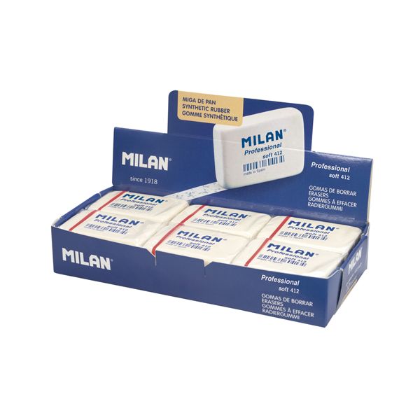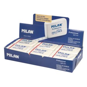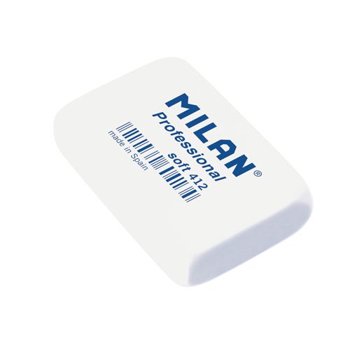 Guma MILAN Profesional soft 412 je určená na mäkký syntetický kaučuk. Môže byť použitá na mazanie širokej škály grafitových ťahov ceruzkou zo všetkých druhov papiera. Biela farba.