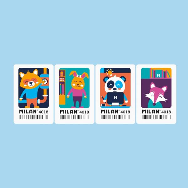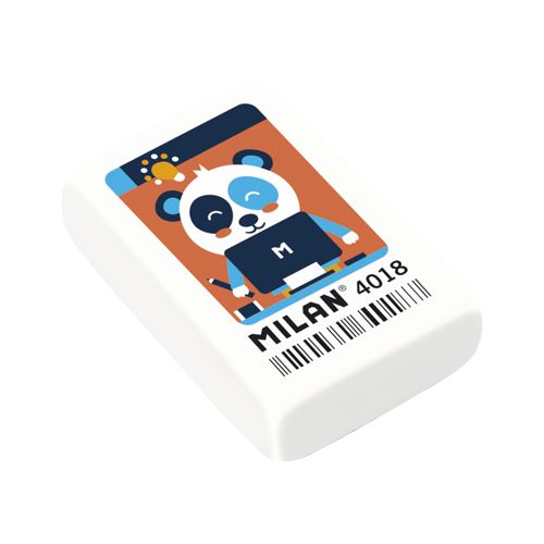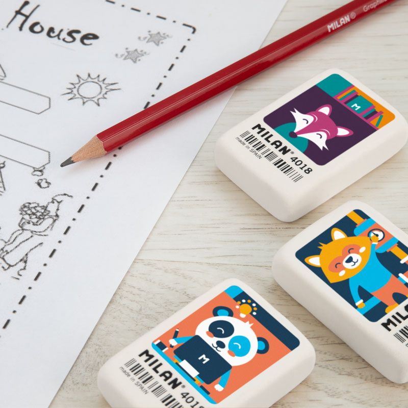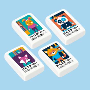 Obdĺžniková guma MILAN 4018 z mäkkej syntetickej gumy. Môže byť použitá na vymazanie širokej škály ťahov grafitovej ceruzky zo všetkých druhov papiera. S rôznymi farebnými detskými motívmi.