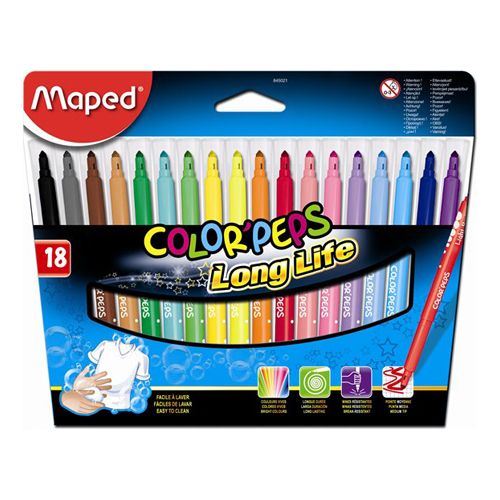 Farebné fixy , ľahko vyprateľný a zmývateľný atrament. Hrot odolný proti zatlačeniu či poškodeniu, žiarivé farby. Trojhranný tvar pre lepšie a pohodlnejšie uchopenie. Dlhá životnosť. Šírka stopy 3,6 mm. Stredne hrubý hrot vhodný na kreslenie a maľovanie. Balenie obsahuje 18 ks. Francúzka značka MAPED zaručuje vysokú kvalitu, funkčnosť a moderný dizajn.