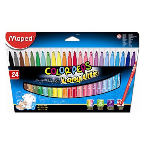 Farebné fixy , ľahko vyprateľný a zmývateľný atrament. Hrot odolný proti zatlačeniu či poškodeniu, žiarivé farby. Trojhranný tvar pre lepšie a pohodlnejšie uchopenie. Dlhá životnosť. Šírka stopy 3,6 mm. Stredne hrubý hrot vhodný na kreslenie a maľovanie. Balenie obsahuje 24 ks. Francúzka značka MAPED zaručuje vysokú kvalitu, funkčnosť a moderný dizajn.