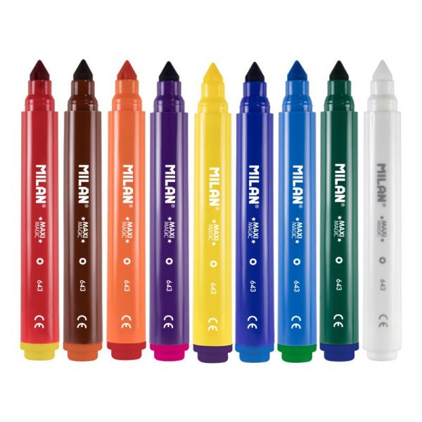Magické fixy MILAN MAXI s hrubším telom pre jednoduchší úchop, vďaka čomu sú ideálne pre deti. V balení sa nachádza 8 ks základných farieb + 2 ks magických fixiek. Guľatý hrot, priemer 7,5 mm. Atrament na vodnej báze. Tieto magické fixy sa vyznačujú špeciálnym atramentom, ktorým dokážete meniť farbu textu, ktorý ste napísali základnou fixou. Postup: Vyfarbite obrázok, počkajte 5 sekúnd a pomocou magickej fixy uvidíte ako sa farby menia.
