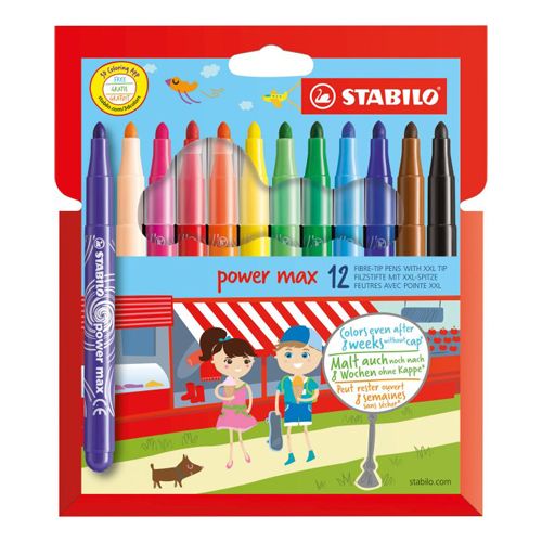 12-kusová sada vysoko kvalitných fixiek STABILO Power Max, s výraznou intenzitou farieb. Tlaku odolný, extra silný hrot pre dlhú životnosť. Atrament na vodnej báze, bez zápachu, vyprateľný. Kvalitná súčasť výbavy každého školáka. Balené v papierovom obale.