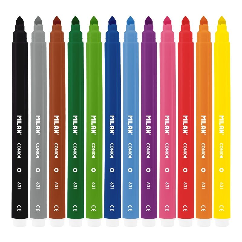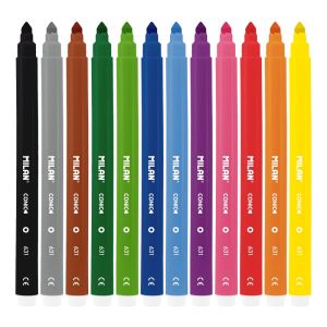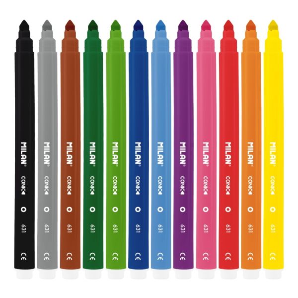 Fixy MILAN s kónickým hrotom (5mm) so silnou a odolnou špičkou. Špička môže byť použitá na jemné linky (0,75mm) alebo silnejšie linky až 3 mm. Hroty sú ideálne pre menšie kresby a väčšie diela, ako sú nástenné plagáty. Atrament na vodnej báze produkuje svetlé farby, ktoré sú ľahko použiteľné a sú miešateľné. balenie obsahuje 12 ks.