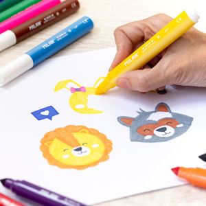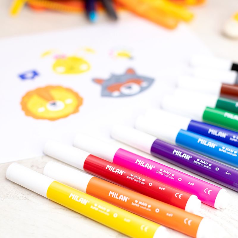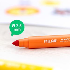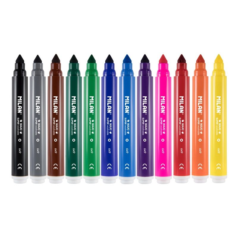 Fixy MAXI s kužeľovou špičkou o priemere 7,5 mm, ktorá sa dá použiť na vytvorenie ťahov od 1 mm do 3,25 mm. Veľkosť MAXI je ideálna pre deti. Atrament na vodnej báze, ktorý umožňuje ľahké nanášanie a miešanie jasných farieb. Kónický hrot odolný voči nárazom a tlaku. balenie obsahuje 12 farieb.