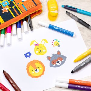 Popisovače vyrobené z PP s ventilačným bezpečenostným uzáverom a vláknovým hrotom odolným voči zatlačeniu. Sú zdravotne nezávadné a vyprateľné. Odolné voči vyschnutiu počas 3 rokov. Šírka stopy: 1,8 mm. Dodávaný v sade 4, 6 alebo 12 farieb.
