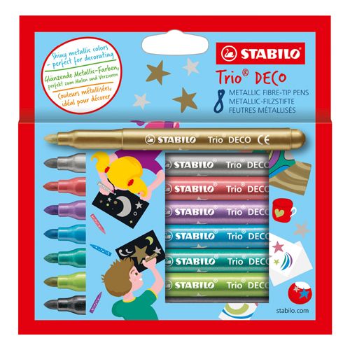 Metalické vláknové fixy STABILO Trio DECO poskytujú deťom a ich umeleckým dielam žiarivú iskru. Dospelí sú nadšení, keď vidia, že ich deti môžu kresliť rôznymi spôsobmi a používať rôzne kresliace pomôcky. 8 trblietavých farieb magicky pritiahne každú detskú ruku. Či už v škole alebo doma s kamarátmi – obrázky získaju špeciálny žiarivý lesk a šmrnc. Vďaka ergonomickému tvaru fixy perfektne padnú do malých detských rúk. Trojhranná úchopová zóna intuitívne navádza k správnemu držaniu už od úplných začiatkov. Extra silný hrot XL so šírkou stopy 3 mm má vysoký výdaj farieb a okamžite vyfarbí veľké plochy papiera, kartónu alebo dreva. Metalická vláknová fixa dodá trblietavý efekt všetkým kreatívnym nápadom, napríklad vianočným želaniam. Vďaka tomu sú veľmi populárne u kreatívcov a fanúšikov "do-it-yourself". A tiež sú skvelým darčekom pre všetkých umeleckých nadšencov!