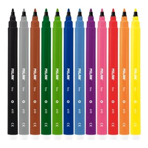 Fixka s guľatým hrotom MILAN fine s jemnou špičkou o priemere 2 mm. Obzvlášť vhodná na kreslenie obrysov a písanie jemnými ťahmi. Farba na vodnej báze, ktorá vytvára jasné a ľahko nanášateľné farby, ktoré sa dajú navzájom kombinovať. Dá sa ľahko vyprať z väčšiny látok. S perforovaným bezpečnostným uzáverom. 12 farieb.