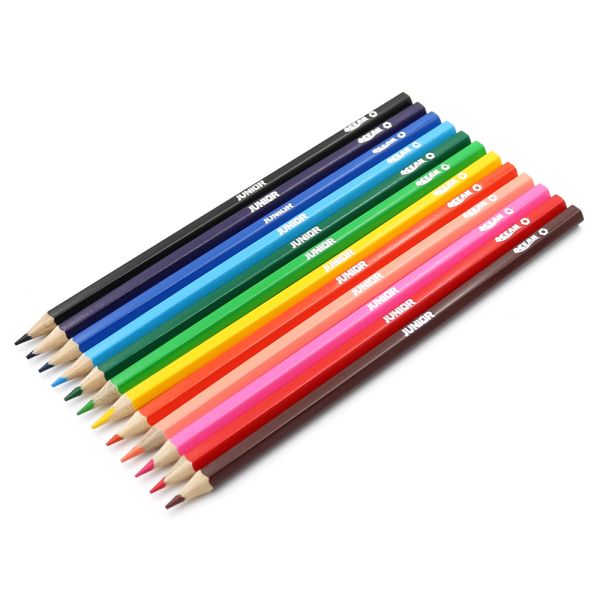 Drevené farebné pastelky sýtych farieb, ktoré vyhovejú rozmanitým potrebám detí. Klasický šesťhranný tvar, určené pre školákov aj predškolákov. Pastelky nemajú na tele žiadne logo výrobcu. Sada obsahuje 12 kusov, balené v papierovej krabičke.
