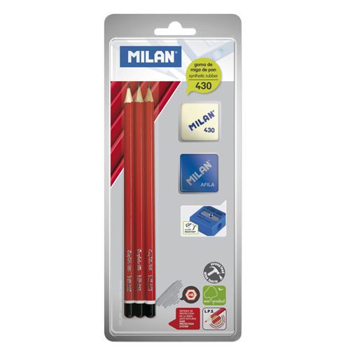 Sada 3 šesťhranných grafitových ceruziek MILAN strednej tvrdosti HB, určených pre písanie a kreslenie. V balení sa nachádza: dizajnové strúhadlo vyhotovené z kvalitnej odolnej ocele a mäkká syntetická guma, vhodná pre odstránenie grafitových stôp zo všetkých druhov povrchov.
