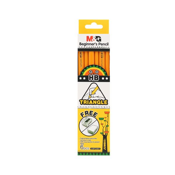 Grafitová ceruzka od značky M&G, podkategória JUMBO. Má trojhranný tvar a je vhodná pre začiatočníkov. Obsahuje šesť kusov v balení, k tomu je strúhadlo a aj guma. Tvrdosť ceruzky je HB.