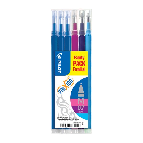 Náplň Pilot Frixion - 3x modrá, 1x fialová, 1x ružová a 1x svetlo modrá. Šírka stopy: 0,7 mm. Balenie obsahuje 6 ks.