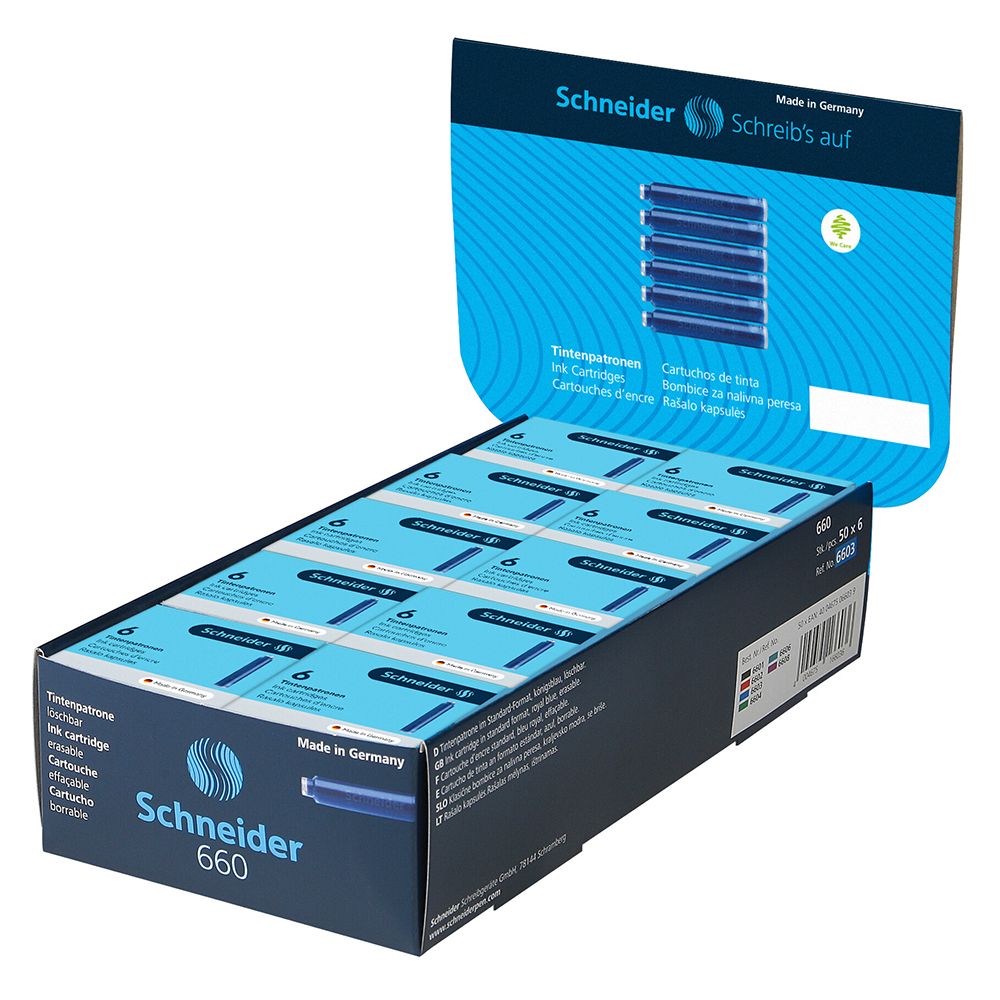 Šesť štandardných atramentových bombičiek. náplň: kráľovská modrá / vymazateľná vhodné pre perá Schneider a mnoho ďalších značiek