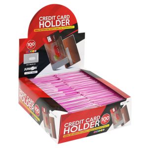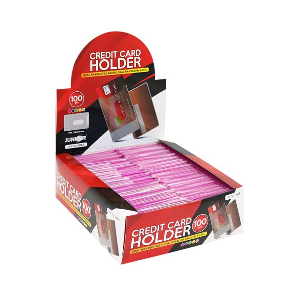 Obal na kreditnú kartu z pevného priehľadného PVC materiálu. Info pre obchodníkov: Celé balenie (100 ks) obsahuje mix farieb po 10 ks - ružovú, modrú, žltú, zelenú + 60 ks čírych. Nedajú sa vybrať len jednotlivé farby.