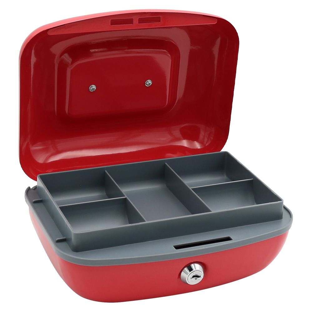 Uzamykateľná pokladnička z kvalitnej ocele v modernom dizajne s plastovou priehradkou na mince a 2 kľúčami. (rozmery: dĺžka 204 mm x šírka 160 mm x výška 97 mm).